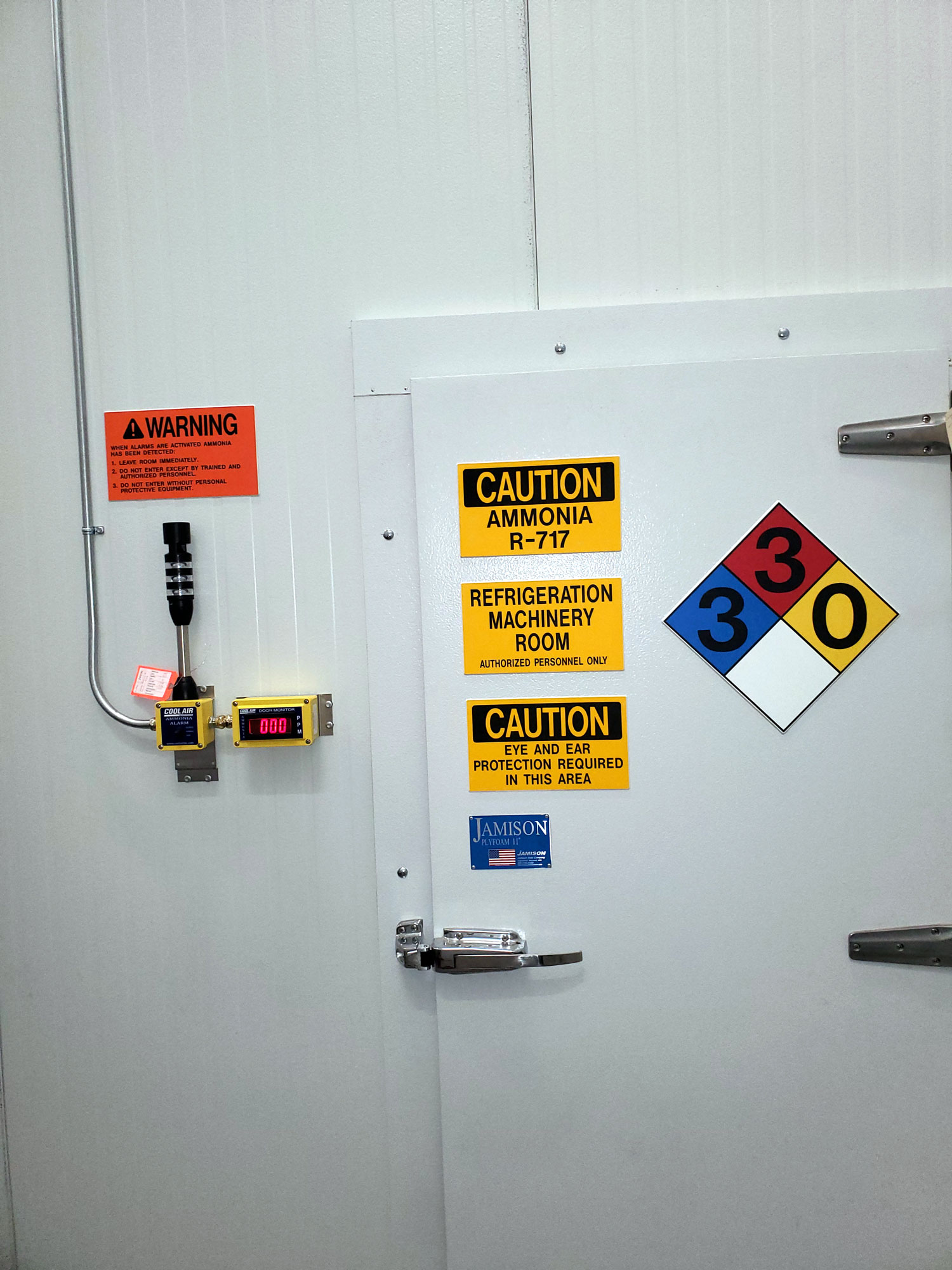 Machinery room principle and auxiliary doors are provided with the required signage indicating the Refrigeration Machinery Room, Authorized Personnel Only, Caution – Ammonia R-717, Caution – Eye and Ear Protection Required, and the NFPA ammonia fire diamond. In addition to the door signage audio and visual alarms for the emergency detection and ventilation system are provided.