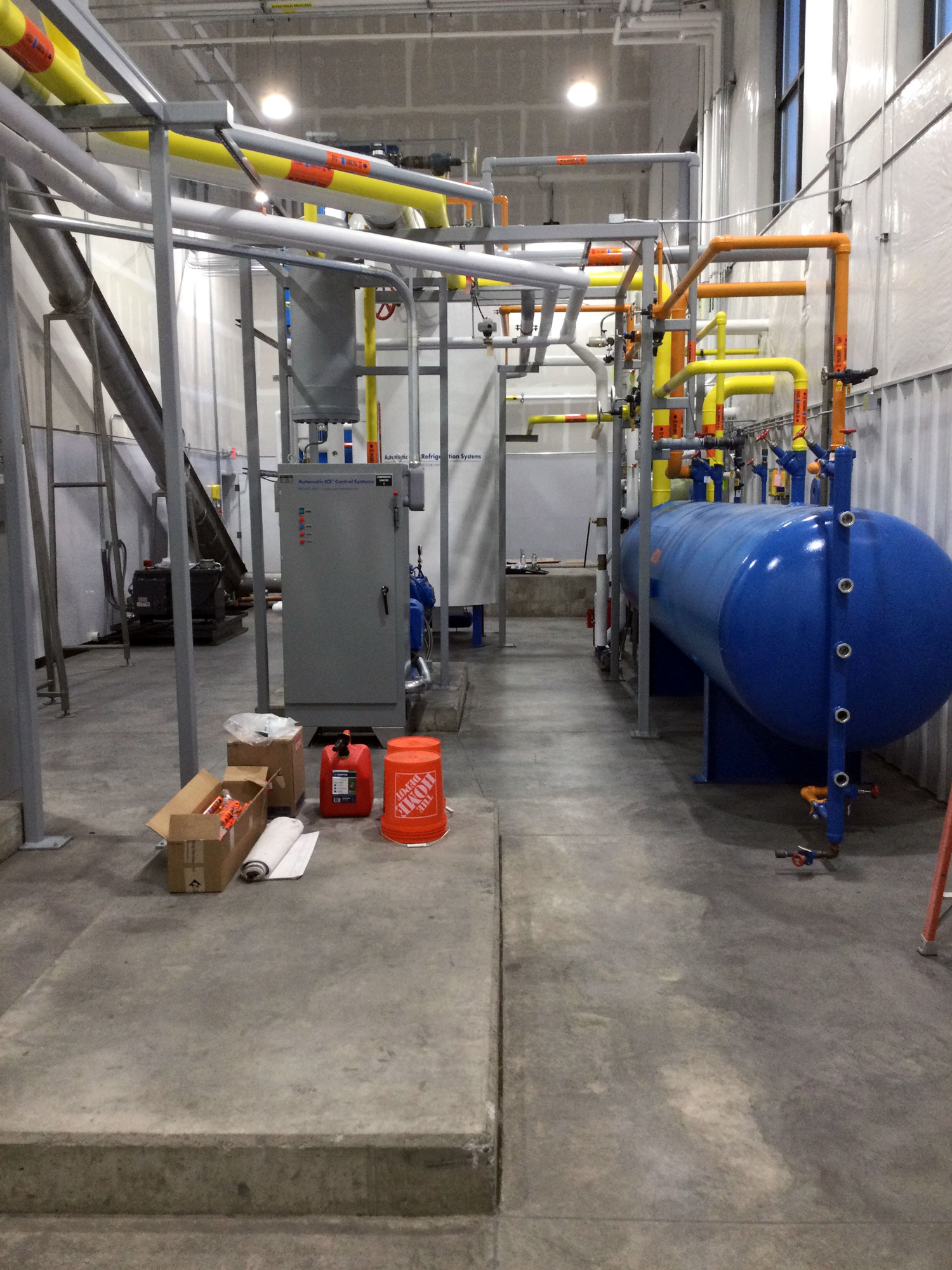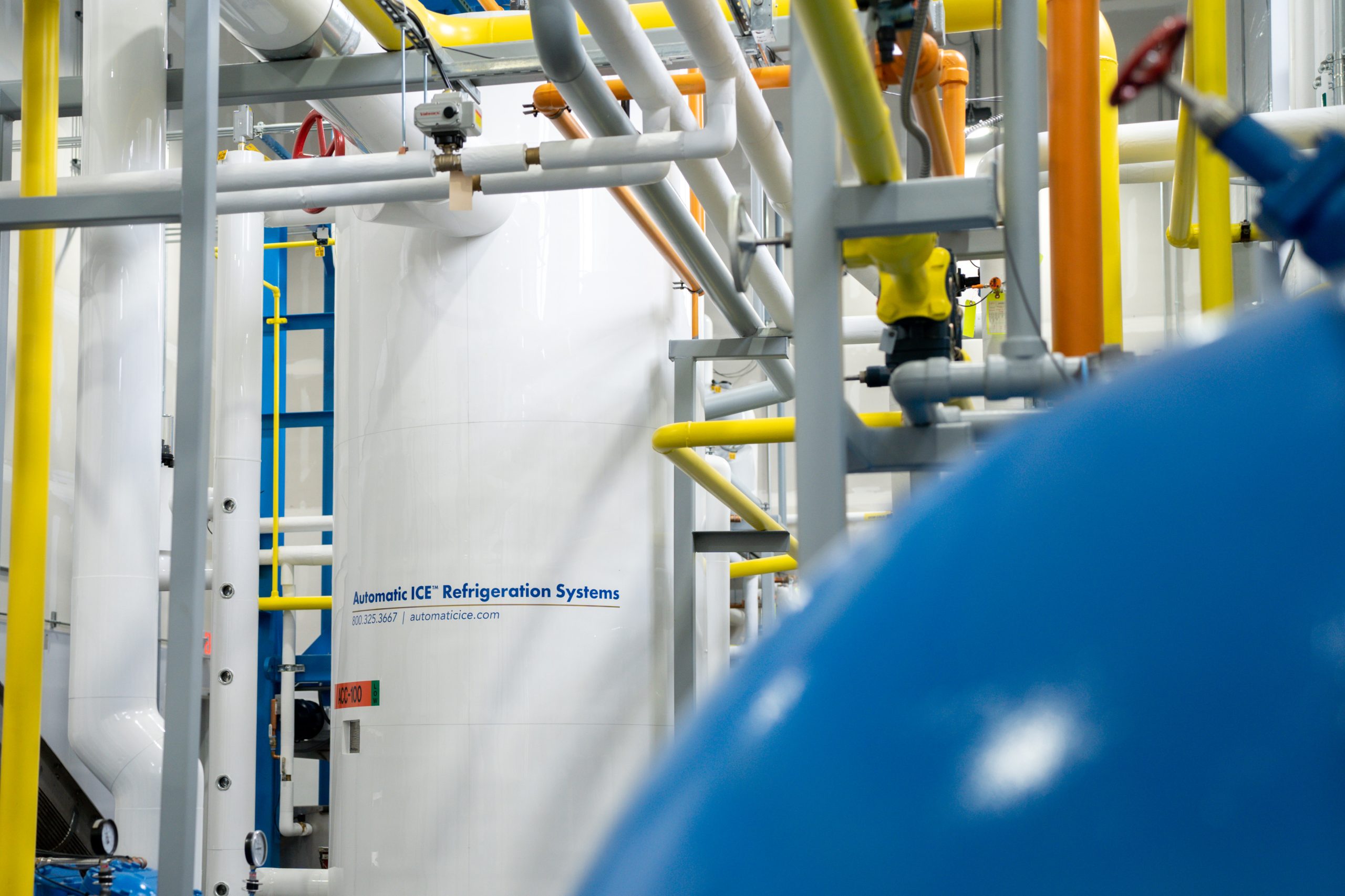 Automatic ICE™ Systems designs every ammonia system to comply with IIAR standards. This includes equipment isolation valves and pump-out valves for equipment maintenance, purge valves for removing non-condensables, oil pots to safely remove oil, and King and Queen valves for automatic isolation of the HPR in case of an ammonia leak. The accumulator vessel is equipped with a level probe as well as a high-level float switch for compressor protection. The AIS control system monitors the exact liquid level with the level probe, and can safely shut down the system before the liquid can reach the high-level cutout float switch. This allows operators to restart the system and troubleshoot while protecting the compressors.