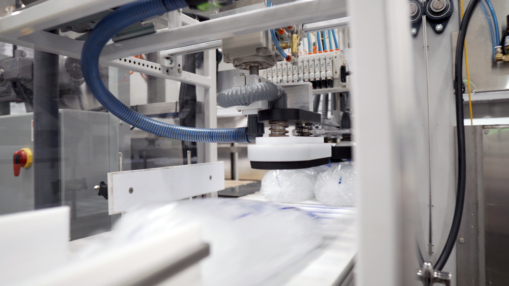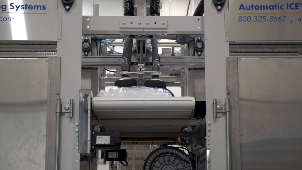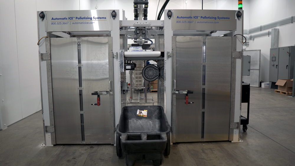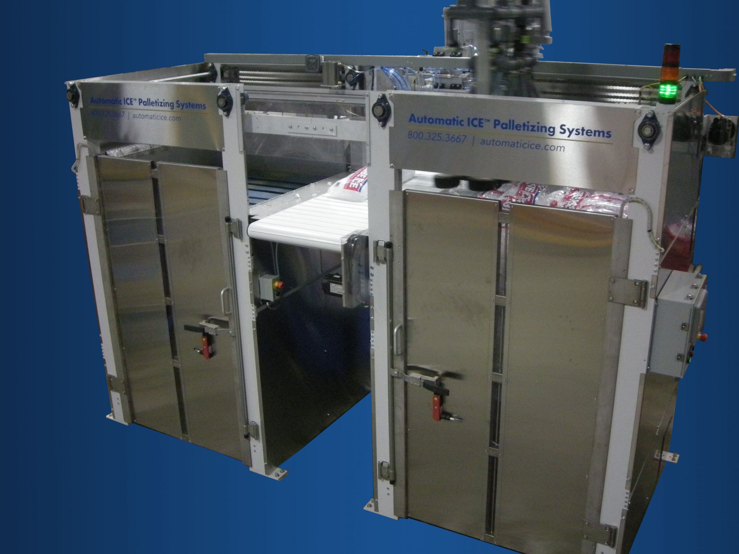 • Cost-effective way to automatically stack ice packages on pallets for storage and delivery