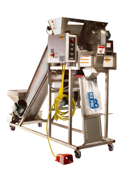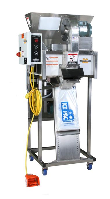 The Matthiesen VLS Bagger is a highly functional piece of equipment for packaging ice products. Load the bottom hopper, and the product is conveyed to the top hopper, which has optional lower and upper limit switches. The volumetric drum is filled in increments of 5 to 25 pounds. Depending on the product type, this equipment can fill up to 40 bags per minute. The real question is, can you keep up?