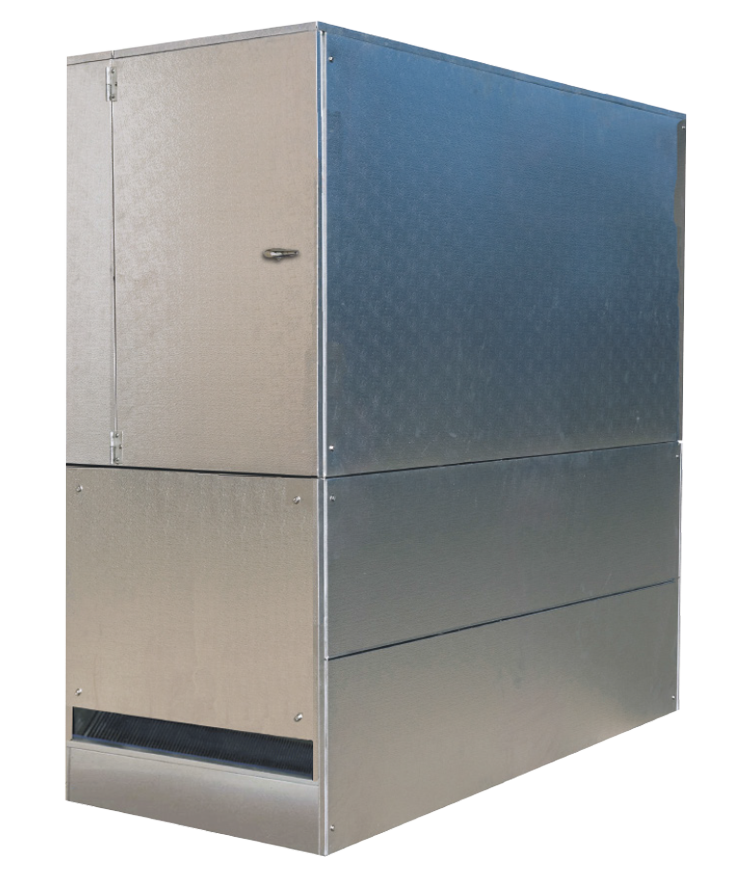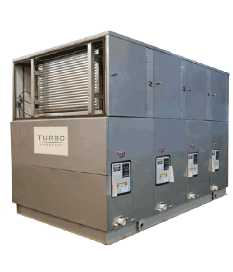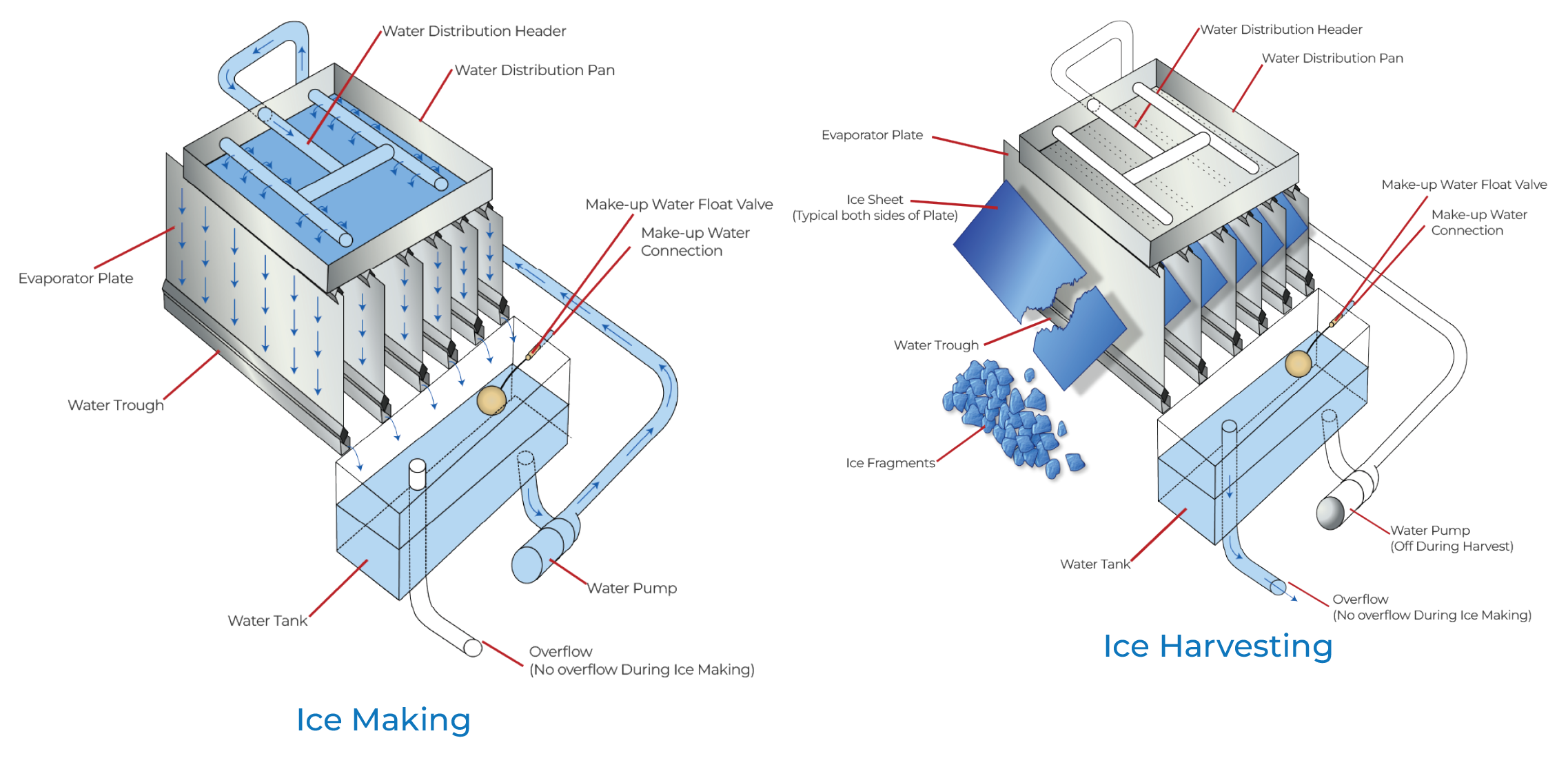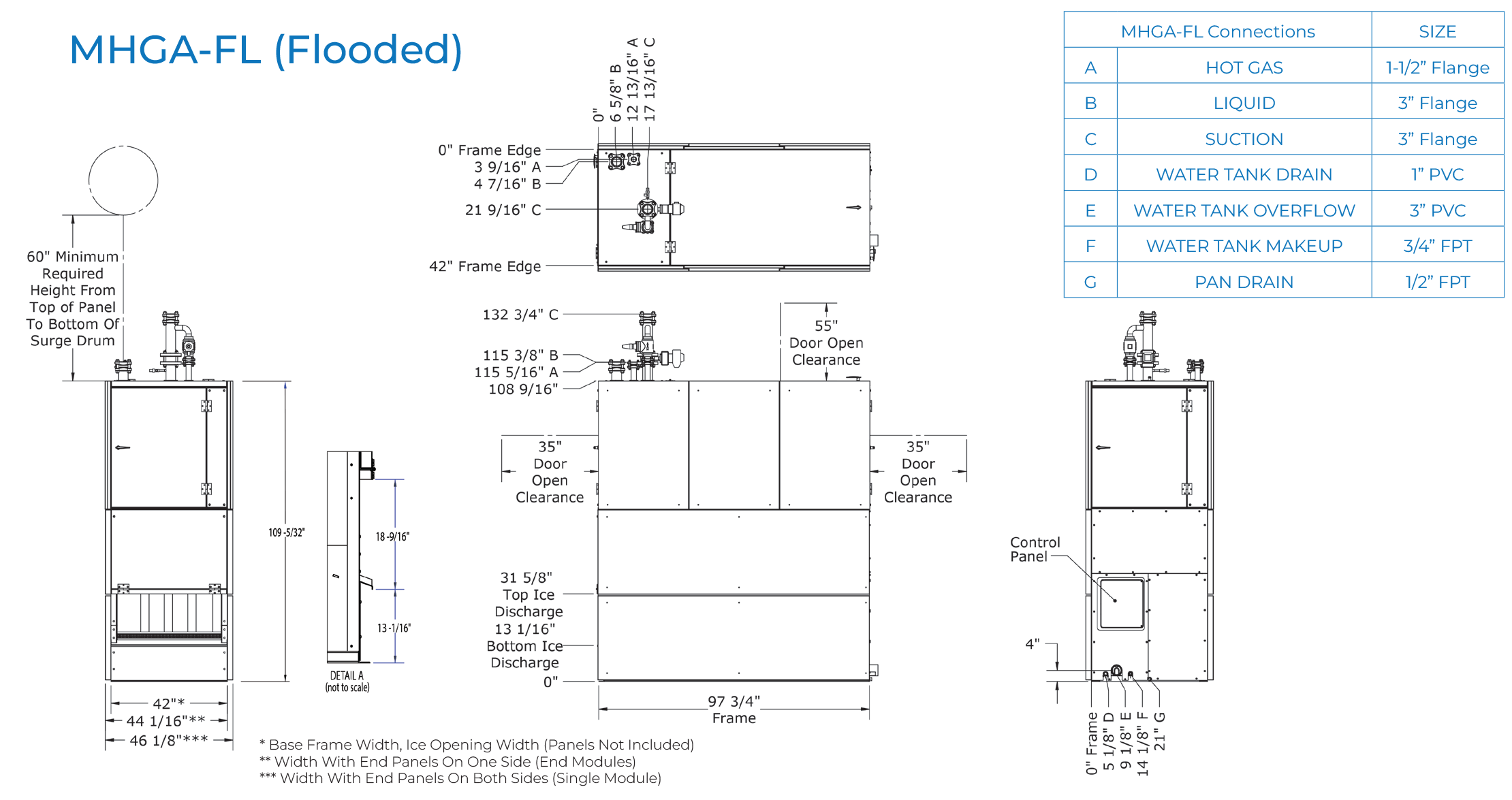 The Turbo Products MHGA (Modular Hot Gas Ammonia) are microprocessor controlled ice modules that can be combined to operate alone or as part of a sequenced modular ice making array for 25 tons to over 300 tons of ice per day. This ice discharges in 1/4” to 1/2” plate fragmented ice which is moist on the surface but does not readily clump in storage. A single master control panel provides network accessibility for precisely monitoring and controlling ice making operations.